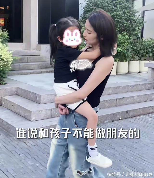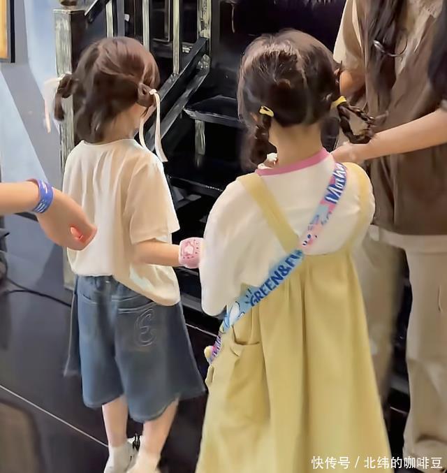 女儿小月亮蓝色T恤配牛仔短裤一双遗传自妈妈的"铅笔腿"已初显超模比例母女同步下台阶的画面被调侃"腿精基因垄断"。