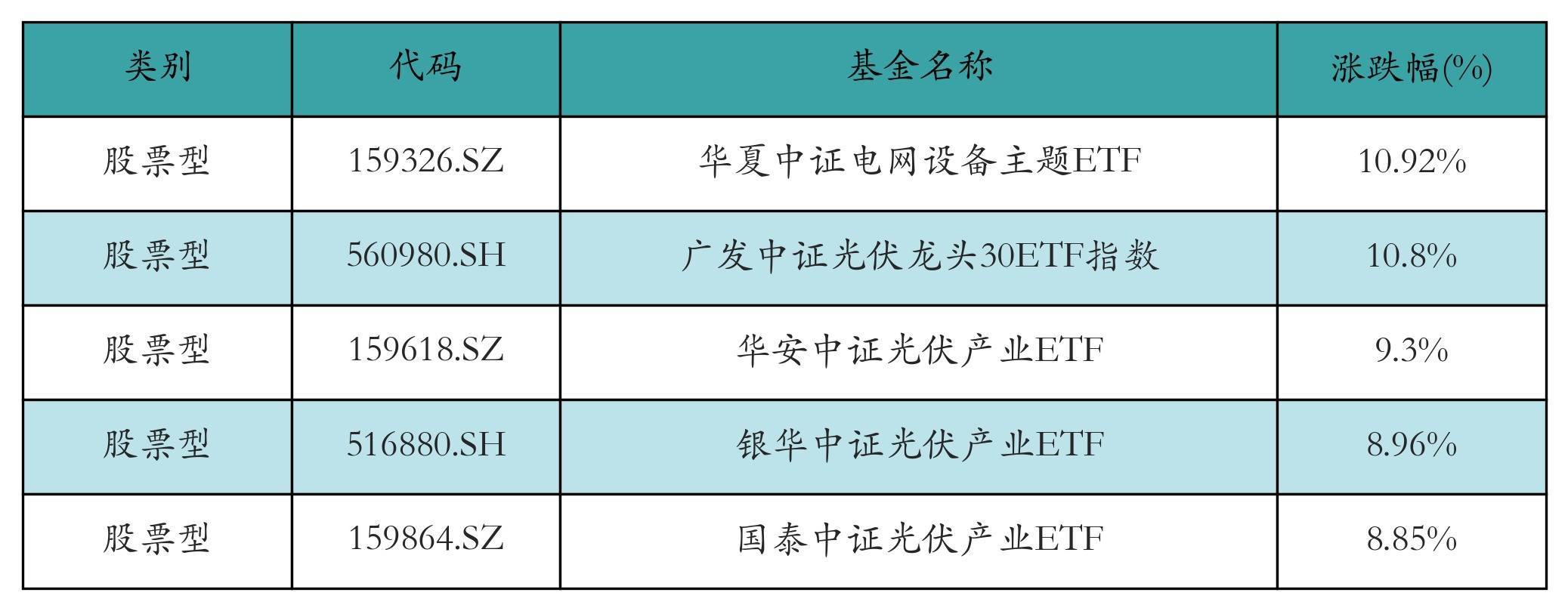 上周股票型ETF涨幅最高的5只ETF及其收益率分别为:华夏中证电网设备主题ETF(10.92%)、广发中证光伏龙头30ETF指数(10.8%)、华安中证光伏产业ETF(9.3%)、银华中证光伏产业ETF(8.96%)、国泰中证光伏产业ETF(8.85%)。详情见下表: