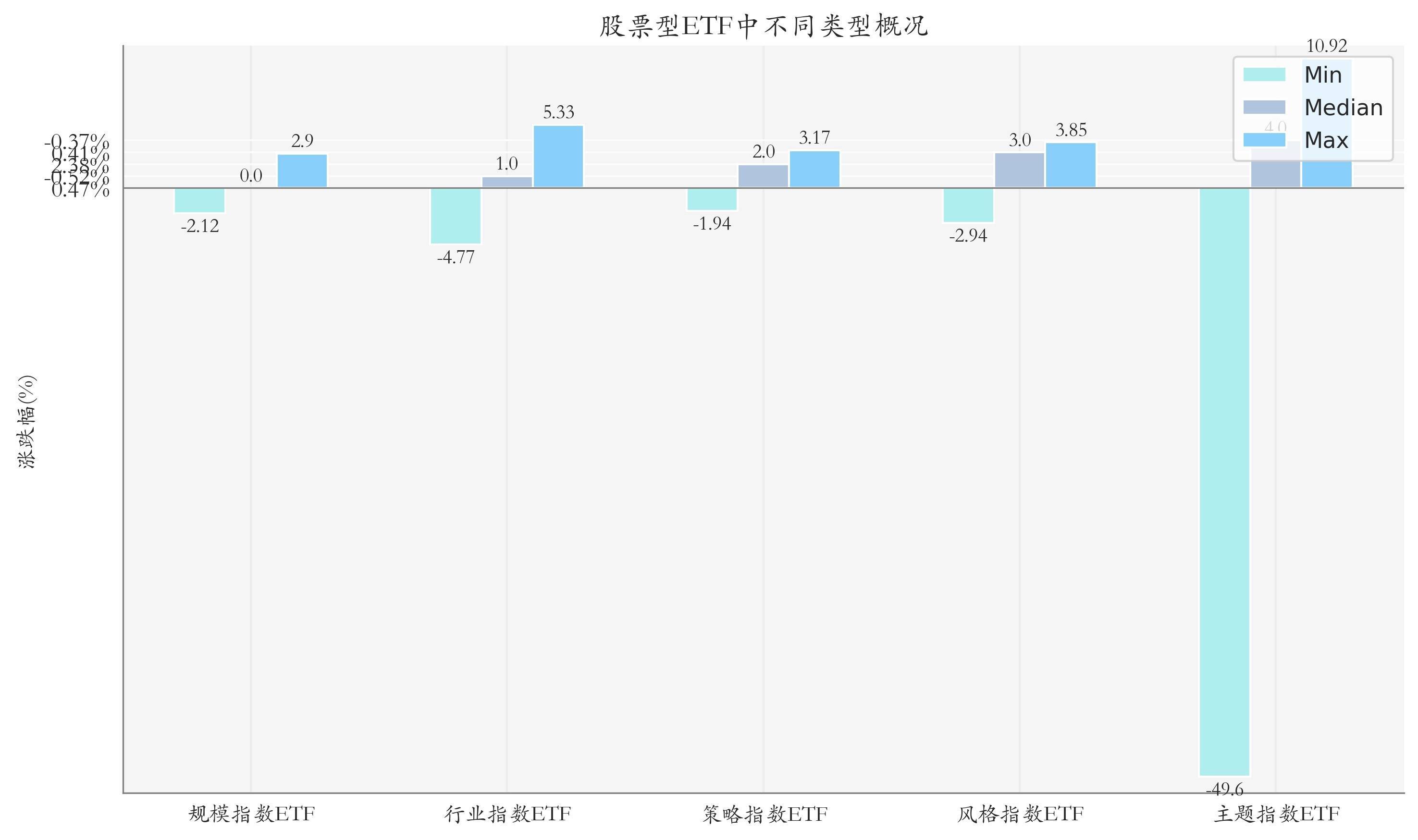 二、ETF市场表现1、股票型ETF整体市场表现上周股票型ETF周度收益率中位数为0.31%%。其中按照不同分类,规模指数ETF中鹏华中证800自由现金流ETF周度收益率最高,为2.9%;行业指数ETF中南方中证新能源ETF周度收益率最高,为5.33%;策略指数ETF中银河上证国有企业红利ETF周度收益率最高,为3.17%;风格指数ETF中易方达国证价值100ETF周度收益率最高,为3.85%;主题指数ETF中华夏中证电网设备主题ETF周度收益率最高,为10.92%。