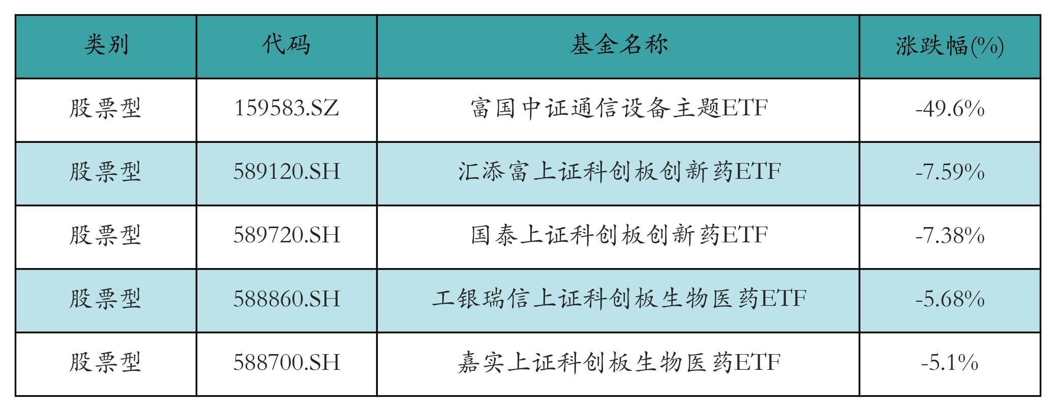 上周股票型ETF跌幅最大的5只ETF及其收益率分别为:富国中证通信设备主题ETF(-49.6%)、汇添富上证科创板创新药ETF(-7.59%)、国泰上证科创板创新药ETF(-7.38%)、工银瑞信上证科创板生物医药ETF(-5.68%)、嘉实上证科创板生物医药ETF(-5.1%)爱配资。详情见下表:
