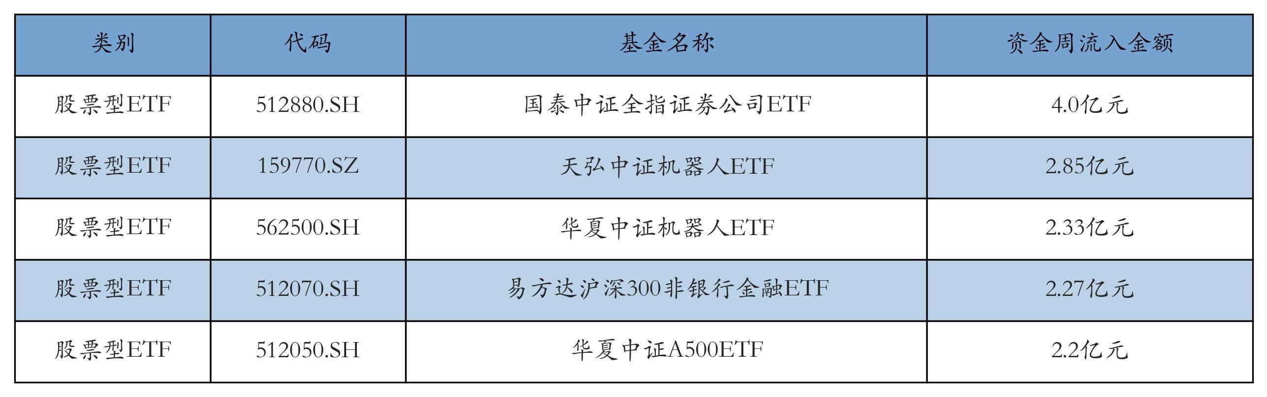 上周股票型ETF资金流入最多的5只ETF及其流入金额分别为:国泰中证全指证券公司ETF(流入4.0亿元)、天弘中证机器人ETF(流入2.85亿元)、华夏中证机器人ETF(流入2.33亿元)、易方达沪深300非银行金融ETF(流入2.27亿元)、华夏中证A500ETF(流入2.2亿元)。详情见下表: